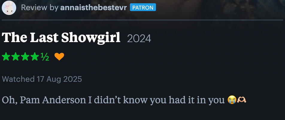 I also watched Gia Coppola’s The last showgirl starring Pamela Anderson and I was blown away. I sobbed on a plane. I really don’t have much to say about it except that it was wonderful, an incredibly nuanced take on womanhood and girlhood and sex and sexy-ness. I will definitely watch it again.